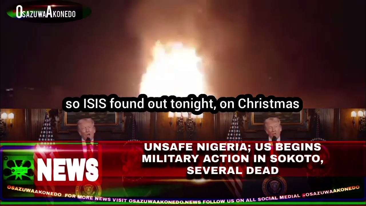 #Breaking News #Jabo #Nigeria #Sokoto #Trump #US ©December 26th, 2025 ®December 26, 2025 4:37 am While many Nigerians were asleep after the 2025 Christmas celebration, the United States, US war ship moved close and took position in the territorial Africa waters, then launched missiles at the dead of the night on Thursday into areas predominantly dominated by the Lakurawa terrorists in the Nigeria North Western State of Sokoto, with President Donald Trump saying many of the terrorists were killed, but, the Islamic State of Iraq and Syria, ISIS in the West Africa Province is yet to issue a statement over the airstrikes on the Lakurawa camps in Sokoto, the armed group that is affiliated with the Islamic State Sahel Province operating in Mali, Niger, and the Nigeria Kebbi and Sokoto states whose activities are mostly observed in five local government areas of Tangaza, Gudu, Illela, Binji, and Silame in Sokoto state, this, some residents at Jabo village in the Tambuwal local government area of Sokoto state posted videos online to indicate that some components used in making the missiles fell on a farmland in the Jabo village, the videos showed alot of the villagers, mostly younger ones holding phones with touch light on, recording the scene of the burning parts of one of the missiles in the farmland, while some took a closer camera angle shot of some of the components that have manufacturing inscriptions dates and brand labels. #OsazuwaAkonedo